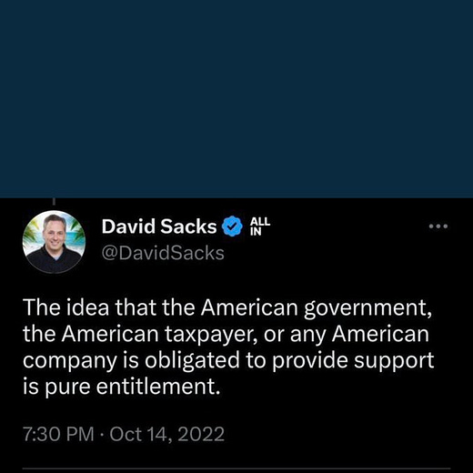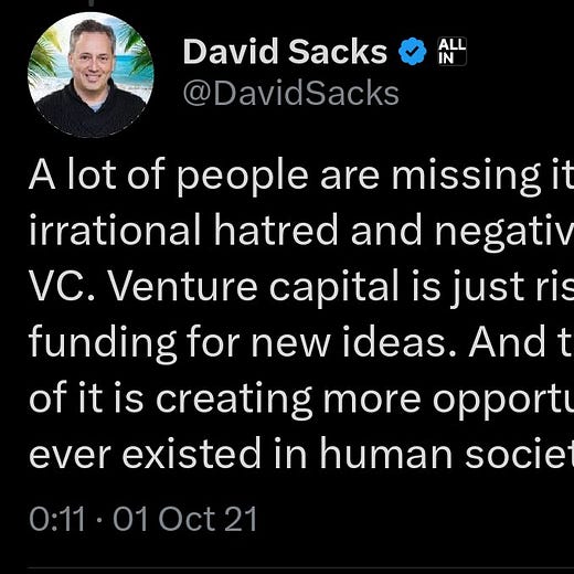 The issues with Silicon Valley Bank that have derived from it's involvement with startup culture are clearly fairly unique to the particulars of how that bank is involved deeply in that culture. Matt Levine's piece on SVB's double exposure is an excellent dive into this. That isn't the reason that the tech community is suddenly under critique nor is it the reason a whole bunch of people on Twitter are talking about why venture capital and their startups shouldn't be bailed out.
