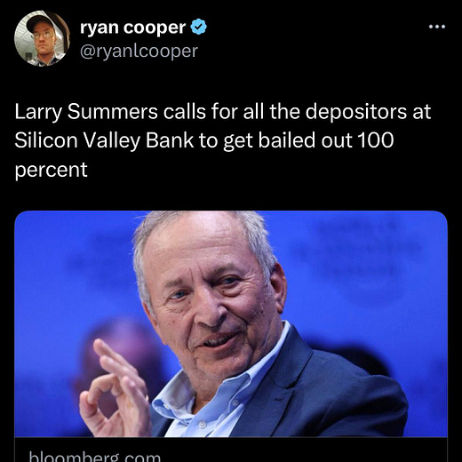 No, the problem is the hypocrisy. Of course no one wants to see the line employees of these companies in trouble. Not to mention, SVB isn't just a bank for startup cash, it has regular employees, standard bank users, housing, and businesses of all types. Generally, most critics don't want to see these depositors underwater.